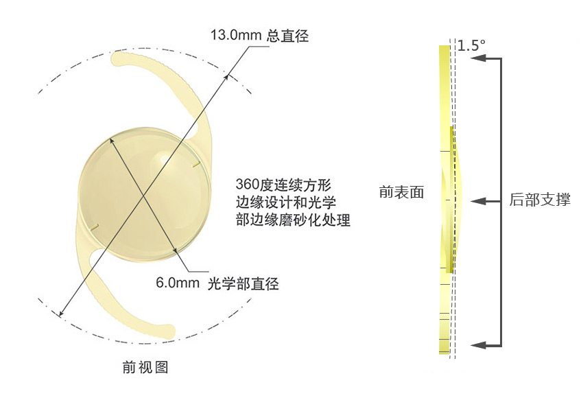 一件式后房人工晶狀體,可折疊,襻形為L(zhǎng)襻。主體及支撐部分材料均由疏水性丙烯酸酯制成,含有紫外吸收劑和藍(lán)光吸收劑,表面經(jīng)肝素改性,光焦度范圍:-10.0D~+36.0D,柱鏡度:1.0D、1.5D、2.25D、3.0D、4.0D,4.5D;光學(xué)設(shè)計(jì):?jiǎn)谓?,非球面。產(chǎn)品經(jīng)環(huán)氧乙烷滅菌,一次性使用。